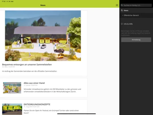 Family 2.0 wird als Medium der Unternehmenskommunikation bei Schneider Umweltservice AG eingesetzt. Das Unternehmen informiert so seine Kunden, Partner und Mitarbeitenden über Neuigkeiten, Arbeitsinformationen, Sicherheitsthemen, Personalveränderungen und mehr. Mit Family 2.0 auf dem Smartphone bleiben alle Interessierten immer auf dem Laufenden. Nutzer der App können Beiträge kommentieren, markieren sowie anonymisiert an qualitativen Umfragen teilnehmen.