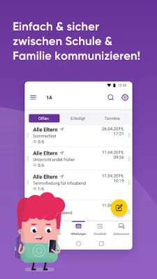 Veranstaltungen, Umfragen, schulweite Kommunikation, Schwarze Bretter, Vorlagen, Anhänge, Klassenchats, Checklisten, Abwesenheiten, Sprechtage, Ruhezeiten, Notfallprofile, Übersetzungen in 40 Sprachen und vieles mehr
