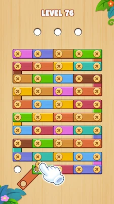 Screw And Wood Nuts & Bolts is a puzzle solving game. As a carpenter, you need to unscrew the nails from the tabletop filled with nails and woods, and place them in the empty spaces without any wooden planks blocking them. When all the nails on the wood are removed, they will fall off, and you will win once all the wooden planks have fallen.
