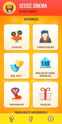Daha fazla eğlence için Hollywood Filmleri, Kurgu Karakterler, Ünlüler, Süper Kahramanlar, TV Şovlaro, Çocuk Filmleri, Müzisyenler, Disney Kitapları, Video Oyunları, Yemekler, Aksiyonlar, Rol ile Anlat 2, Futbol, Doğa ve Meslekleri içeren ayrıcalıklı kategorileri indiriniz. Sessiz Sinema – Kelimeyi Tahmin Et!