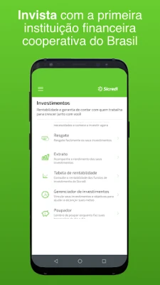 transferências, consultar saldo, pagar contas, fazer investimentos e muito mais. Baixe agora e acompanhe sua conta na primeira instituição financeira cooperativa do Brasil.