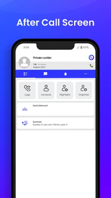 Our app shows an aftercall enabling you to identify incoming calls as they happen so you can access contact list, call logs, favorite (Highlited) Contact list and other calling tools (Organized) immediately after the incoming call.