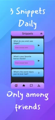 Snippets is an all-new social media app that's unlike any other social media app. By asking random questions throughout the day, visible only to your friends, Snippets hopes to create an environment where you can learn more about your friends, even if sometimes it's some random things, and have real discussions about others' answers to the questions. Snippets' goal is not to keep you on the app the longest or make you see a ton of ads, its goal is to show how social media can be beneficial and to strengthen friendships.