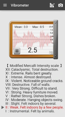 Vibrometer uses the phone sensors to measure vibration or an earthquake, and it shows a reference as a seism detector.