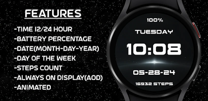 Animated Space Earth Galaxy Stars Watchface for your Wear OS smartwatch! Watchface is available on devices running Wear OS API level 28 and higher. English watchface only. Thanks and enjoy!