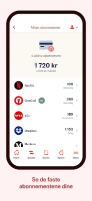 • Sjekke saldo og overførsler • Skanne regninger med mobilkamera • Få oversikt over abonnement og regelmessige betalinger • Søke om nytt lån eller øke eksisterende lån • Bestille konto og kort • Hente PIN-kode for kortet ditt • Se og kjøpe forsikringer • Se og kjøpe fond • Få god oversikt over økonomien din • Booke møte med en av våre rådgivere • Kontakte kundeservice