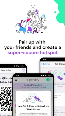 With Pair & Share you can easily share cellular connections between multiple Speedify users on the same Wi-Fi network or personal hotspot. That means more stable connections on the road, at conferences and concerts, or while livestreaming. Grab your crew and create a super connection!