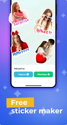 StickApp – is a free sticker maker for WhatsApp and Telegram. It is an all-in-one sticker photo editor, which helps you to make your own picture stickers fast and easily. Create an unlimited number of sticker packs and enjoy chatting.
