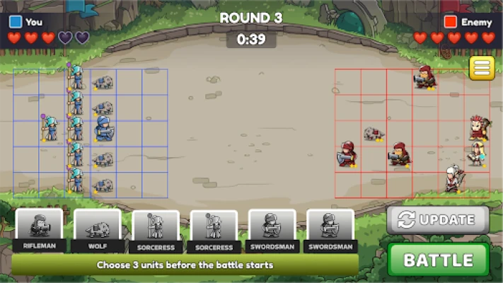 Step into a world of medieval fantasy where every battle is a test of strategy and cunning. In Stone of Strife, you lead armies into fast-paced clashes where only the sharpest tactician prevails. Build your forces, merge warriors into unstoppable champions, and dominate the battlefield in epic 5-round duels!