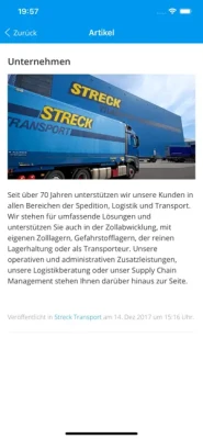Mit dieser kostenfreien App erfahren Sie aktuelle Informationen und Neuigkeiten aus dem Transport- und Logistikunternehmen Streck Transport.