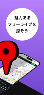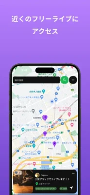 Map上で、現在地から近いフリーライブの情報をリアルタイムで確認できます。 暇な時に近くのライブにすぐアクセスできるようになります。