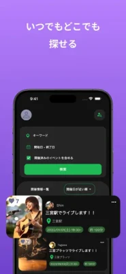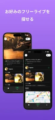 今までの、フリーライブを道端で「見つける」時代から、アプリ上で「探す」時代へと進化し、あなたの好きなライブをどこでも見つけられるようになります。