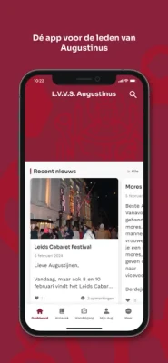 De L.V.V.S. Augustinus-app, ontwikkeld voor leden. Ben jij lid bij Augustinus en wil jij op de hoogte gehouden worden over wat er allemaal speelt op onze vereniging? Download dan nu de app! Via onze app word je op de hoogte gehouden over aankomende evenementen, recent nieuws, bekijk je de hele almanak, reageer je op elkaars prikbordberichten, bekijk je foto’s en nog veel meer. Ook vind je alle benodigde informatie over Augustinus.