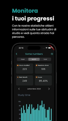 OTTIMIZZA IL TUO STUDIO: Le nostre statistiche ti aiutano a capire meglio come gestire il tuo tempo, migliorare la tua produttività e rimanere motivato. Visualizza i tuoi progressi e trova nuovi modi per diventare più efficiente.