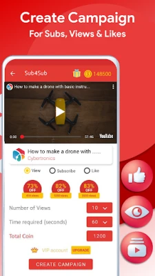 Some easy steps and you are done: 1. Create campaign with your earned coins. 2. Get real views for video campaign. 3. Get subscribers for channel with subscription Campaign.