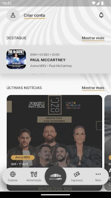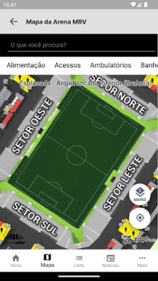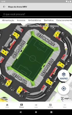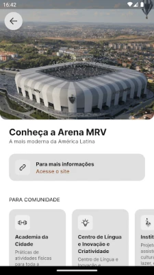 o Calendário de jogos e eventos na Arena o Loja da Arena o Carteira de Ingressos o Estacionamento - reservas, disponibilidade de vagas, etc o Planner do Fã o Como chegar na Arena - Integração com Maps, Google Maps e Waze; melhores vias de acesso via transporte público, carro, ou outros meios o Alimentação - compre comida e bebida através do App na hora dos eventos ou antecipadamente o Notícias o Redes Sociais o A Arena o Serviços o FAQ