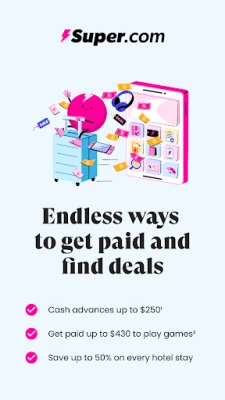 Super.com (previously Snaptravel) is the all-in-one app that helps you save more, earn more, and spend smarter—right from your phone! Whether you're looking for huge travel discounts, cash advances, credit-building tools, cashback on purchases, or ways to earn extra money, Super.com puts more money back in your pocket.