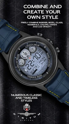 The SWF Digitum Digital PRO Series allows you to create thousands of different combinations by freely combining border, bezel, glass, numerals, quarters, hands and colors.