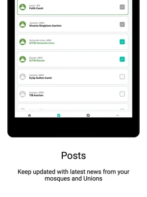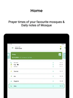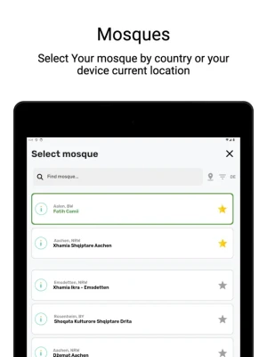 - find the nearest mosque from a list of all the mosques in a specific country - get detailed information about specific mosques - show daily prayer times including mosque-adjusted times - subscribe to a mosque for daily notes - subscribe to push notifications for news from differe