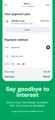 Tabby lets you shop what you love and split purchases into four monthly payments — with no interest, no hidden fees and no surprises. Whether you're shopping online or in store, Tabby gives you control, financial flexibility and peace of mind.