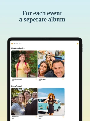 You have all pictures in one place and you can decide if only you or your guests can see the entries. You have unlimited access to your albums. In addition, no registration is necessary. This makes the app easy and usable for everyone!