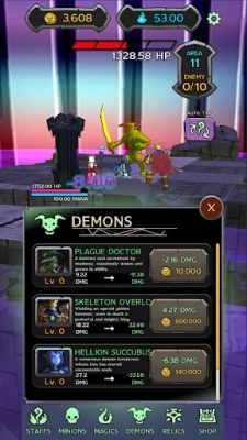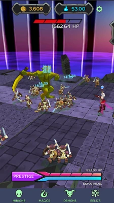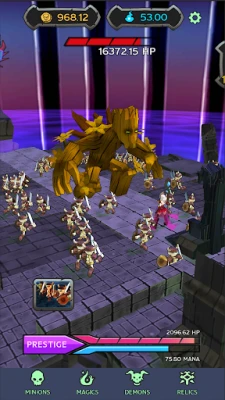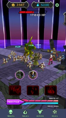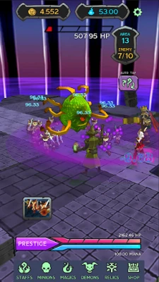 Upgrade staffs to gain higher base attacks. Raise minions such as the Skeleton, Goblin and Drake from the far depths. Employ the help of powerful demons and use the prestige spell to earn souls, upgrade relics and unlock your necromancers ability to move on to bigger bosses.