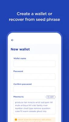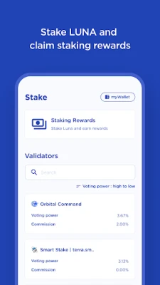 - Non-custodial wallet application (you control your keys) - Create a new Terra wallet or recover from seed phrase - Manage LUNA and CW20 tokens - View your transaction history - Stake LUNA and claim staking rewards - Connect with web smart contract interfaces