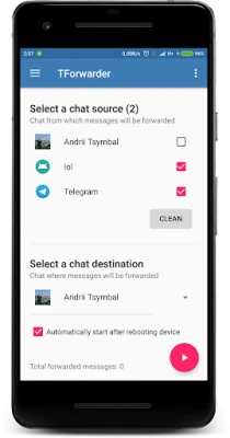 TForwarder can automatically forward messages for you by keyword or without any filters from selected telegram chats to needed telegram channel or group or directly for your friend.