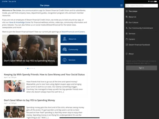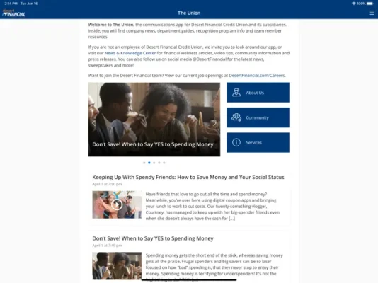 The Union is your one-stop-shop for news, events, training information, updates, branch locations and more!Using the app, you can participate, interact and be social with DFCU and our family of companies, while getting the latest info about how we share success with you, our members and the community.Stay in contact with us and learn more about what's happening in the Desert Financial community.