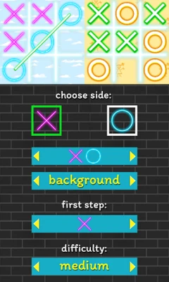 • Exciting xo game board designs where you can choose noughts and crosses graphics set, first move options, backgrounds.