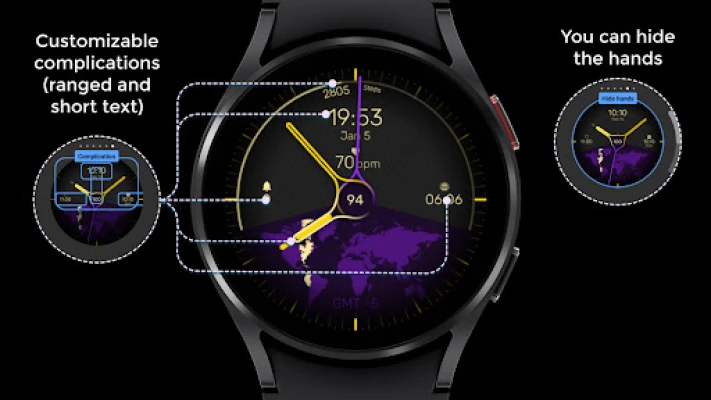 A watch face that has been carefully created, displays the user's current time zone, and includes a number of adjustable options.