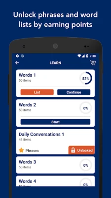 - Yeni kelime öğrenerek, pratik ve tekrar yaparak puan topla. Topladığın puanlarla sık kullanılan cümle kalıplarının ve grupların kilidini aç.