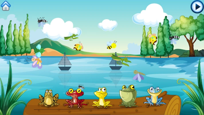 A counting song that features five unique frogs that love to eat bugs - and there are a lot of bugs! As the song progresses, the frogs jump in the water until there are none left. Tap on the bugs to eat them, move the frogs around, touch the sailboats, and more!