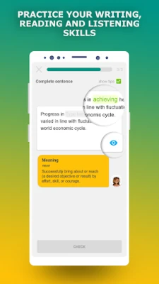 Each English word in this TOEFL vocabulary builder app is pronounced by native American English speakers so you can immediately perceive the speech by ear, which is very important for the TOEFL Listening module. Because of unique learning technique you will keep in mind the correct spelling of English words forever, which will also increase your band in the TOEFL Writing module.