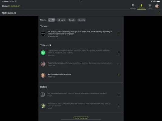 Receive messages and push notifications for all your activity inside Torre:- Updates about your jobs and applications- Job and candidate alerts- Incoming messages, signals, recommendations, and more
