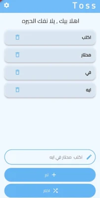Whether you're trying to choose what to eat, who goes first, or just need a quick random pick from a list — TOSS makes it easy. Just enter your options, tap the button, and let the app randomly select for you. No more overthinking or endless debates!