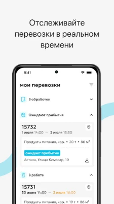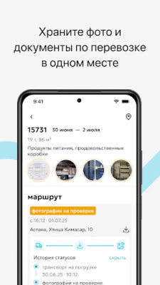 В приложении доступна вся информация по перевозкам. Можно посмотреть текущий статус перевозки, фотографии с пунктов погрузки и выгрузки, а так же местоположение водителя на карте.
