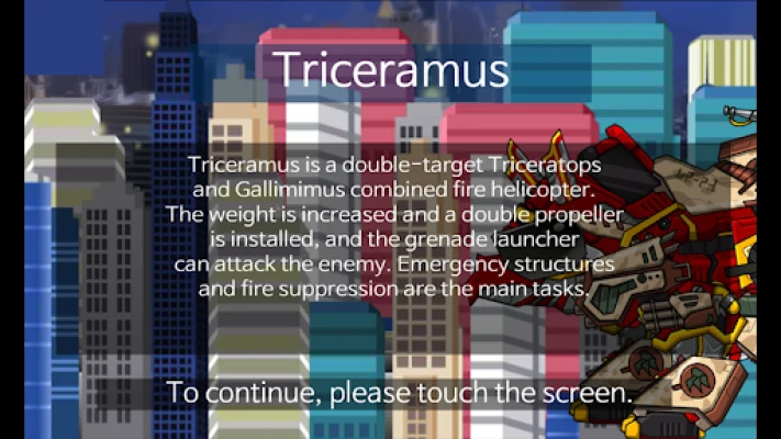 "Triceramus is a double-target Triceratops and Gallimimus combined fire helicopter. The weight is increased and a double propeller is installed, and the grenade launcher can attack the enemy. Emergency structures and fire suppression are the main tasks."
