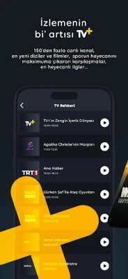 Yerli ve yabancı diziler, yerli ve yabancı filmler, çizgi filmler, belgeseller, canlı TV kanalları ve programları başta olmak üzere yüzlerce içerik TV+’ta sizleri bekliyor. Dizi ve film izleme keyfini doyasıya yaşayabileceğiniz TV+’ta sunulan filmler, diziler ve diğer içerikler tüm operatör kullanıcılarının kullanımına açıktır. Dilerseniz abone olmadan sevdiğiniz filmleri kiralayabilirsiniz. Dizi ve sinema izleme keyfini evinize taşımak isterseniz hızlıca TV+ uygulamasını indirebilir, en iyi filmleri ve dizileri izlemeye başlayabilirsiniz.