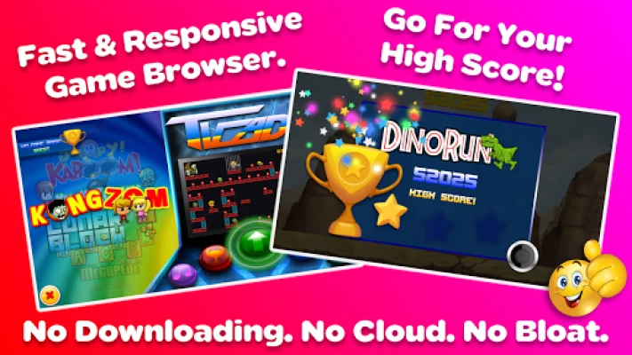 * NO ads. NO in game purchases. * 60 Games included. (More on the way!) * Easy to grasp "1 hand control" for everything. * Arcade, matching, shooters, puzzle games and more! * Native application for fast, smooth game play.