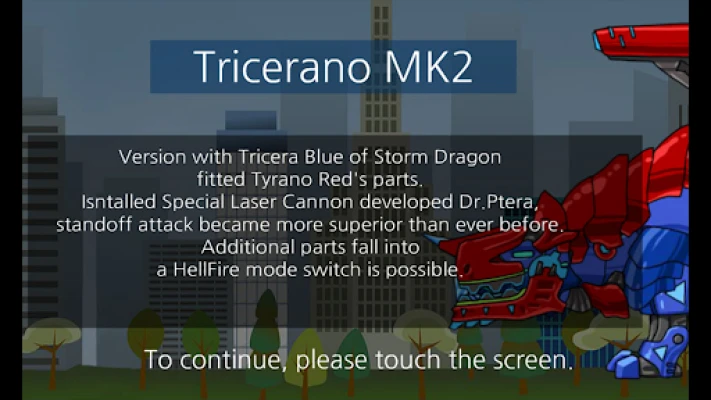 "Tyrannotops is a version equipped with Tricera Blue parts with Tyranno Red belonging to the Storm Dragon. Though the ability to combat short-range combat is less than that of the Tyrannotops MK2 equipped with a Paladin armor It is specialized in guerrillas combat because of its increase maneuverability with lightweight parts."