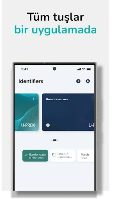 U-Prox Mobile ID, U-Prox aile erişim kontrol cihazları tarafından güvenli hale getirilen alana tek tıkla erişim sağlamak için kullanılır. Uygulama birden fazla anahtar saklar, bu da U-Prox Mobile ID'nin bağımsız tesislerde kullanılmasını mümkün kılar. U-Prox marka tarzı arayüz, uygulamanın kullanımını mümkün olduğunca kolay hale getirir.