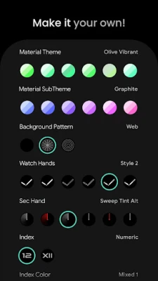 • make it your own, combine themes, watch hands, index and custom complications