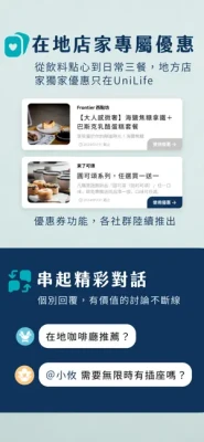 你需要的在地/旅遊資訊都在這!UniLife 為每個城市打造專屬社群,完整搜集了在地資訊、地方優惠,並聚集了一群最懂地方的在地達人,讓你透過即時交流與生活經驗分享,一站式解決所有在地需求。