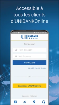 Pour vous connecter à UniMobile, vous devez être préalablement inscrit à nos services bancaires par internet « UNIBANKOnline » et utiliser les mêmes informations nécessaires pour votre connexion à UNIBANKOnline.