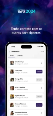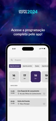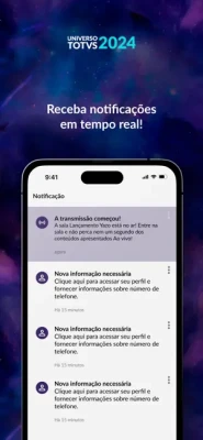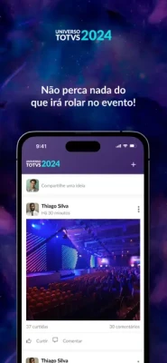 Com o aplicativo UNIVERSO TOTVS 2024, você tem acesso a uma rede social exclusiva, pode fazer novos contatos, enviar perguntas aos palestrantes, trocar mensagens com outros participantes, enfim, interagir com a comunidade. Além disso, você pode consultar a programação, avaliar conteúdos, dar feedback e responder quizzes. Utilize o APP e aproveite ao máximo os recursos.