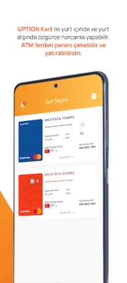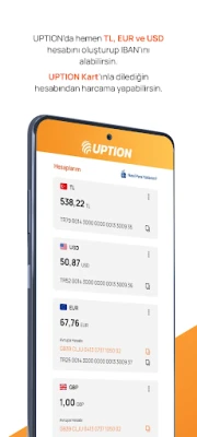 Uygulama içerisinden UPTION Kart’a başvurarak TL, USD veya EUR hesaplarına bağlı bir kart sahibi olabilir, tüm dünyada ister online, ister de fiziksel olarak kartını kullanabilirsin. İstediğin zaman bağlı olan hesabını değiştirerek kur farkından etkilenmezsin. UPTION Kart ile tüm ATM’lerden para çekebilir/yatırabilirsin.