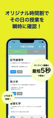 UTifyオリジナルの時間割を開発。その日に受ける授業が一目でわかり、講義のZoomやLMSにダイレクトに飛べるから出席が簡単!それぞれの授業カードに細かい連絡事項をメモできる。