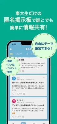 「サークルどうしよう…」「進振りどこにしよう…」「就活の説明会みんな出るのかな…」学生生活で出てくる疑問や不安を共有して解決する学生掲示板!匿名で使えるから安心!ライク、コメント、フォロー、通知機能あり。
