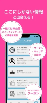 イベント情報・・・サークル主催の新歓や企業主催の就活の説明会など、東大生が参加できるイベントを一覧で表示。情報は随時更新中!